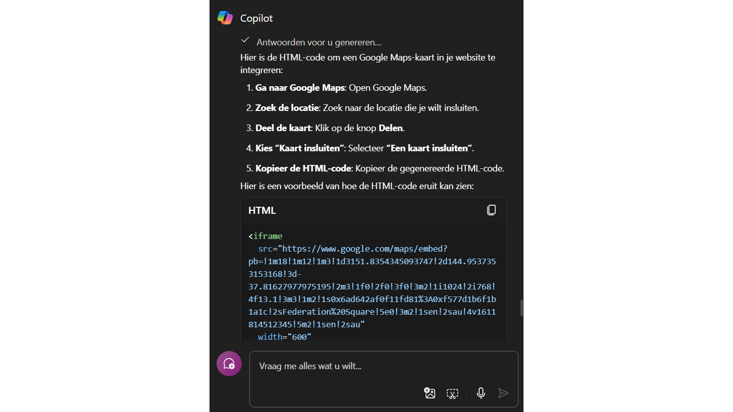 Copilot kan ook coderen. Vertel hem welke codetaal je nodig hebt en wat je wilt dat de code doet. Het antwoord bevat de geformatteerde code die je dan kunt kopiëren en in een document kunt plakken. Dat kan gaan om heel eenvoudige dingetjes zoals een stukje Google Maps in een webpagina integreren of het debuggen van code. Leg Copilot een stukje kapotte code voor en de assistent detecteert de fouten, legt deze uit en genereert de juiste code.