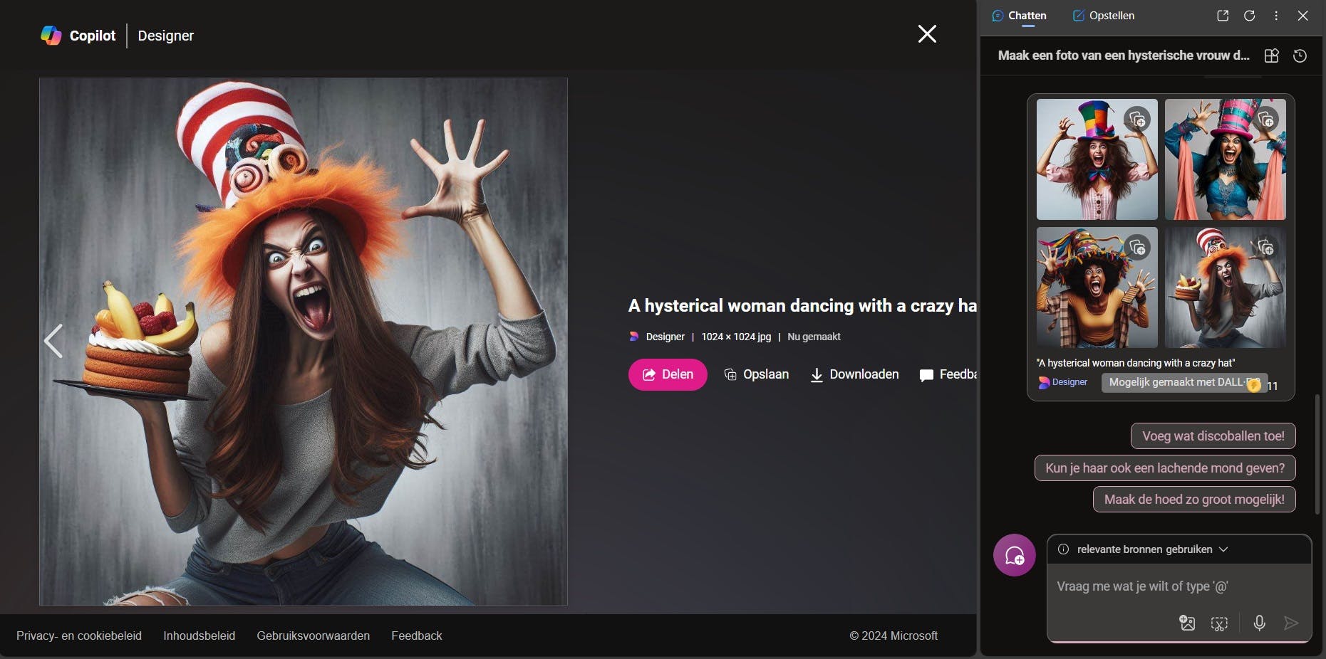 Door de integratie met Designer kan Copilot afbeeldingen genereren. Je vertelt zo nauwkeurig mogelijk wat er op het plaatje moet staan en je geeft aan welke stijl je op het oog hebt. Copilot herschrijft de prompt om die daarna naar de afbeeldinggeneratoren te zenden: Dall-E 3 en Microsoft Designer.