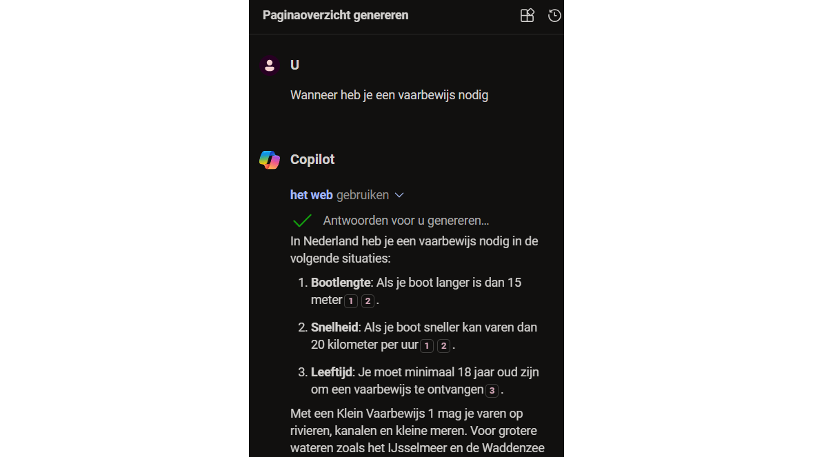 In ons voorbeeld vroegen we bijvoorbeeld: “Wanneer heb je een vaarbewijs nodig?” De AI-assistent geeft eerst het antwoord. Daarna somt hij de websites op waar we meer informatie kunnen vinden. Tot slot stelt hij nog vier vragen die ook interessant kunnen zijn voor dit onderwerp, zoals: “Wat zijn de kosten voor een vaarbewijs?” en “Hoe kan ik me aanmelden voor het examen?”
