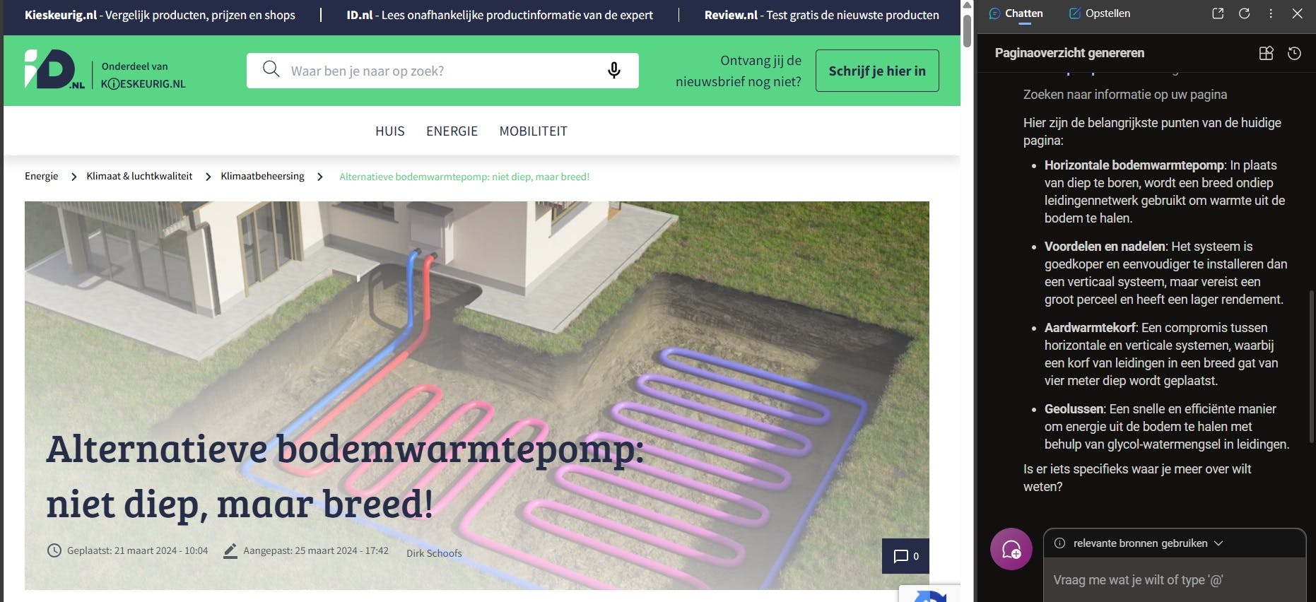 Copilot werkt uitstekend als onderzoeksassistent. Als je info zoekt over een bepaald onderwerp dan kun je dat laten voorbereiden door Copilot. Erg fijn is dat de assistent niet alleen een helder antwoord geeft, hij toont daarbij ook de bronverwijzingen. Daardoor kun je doorklikken en de informatie controleren en verder lezen.