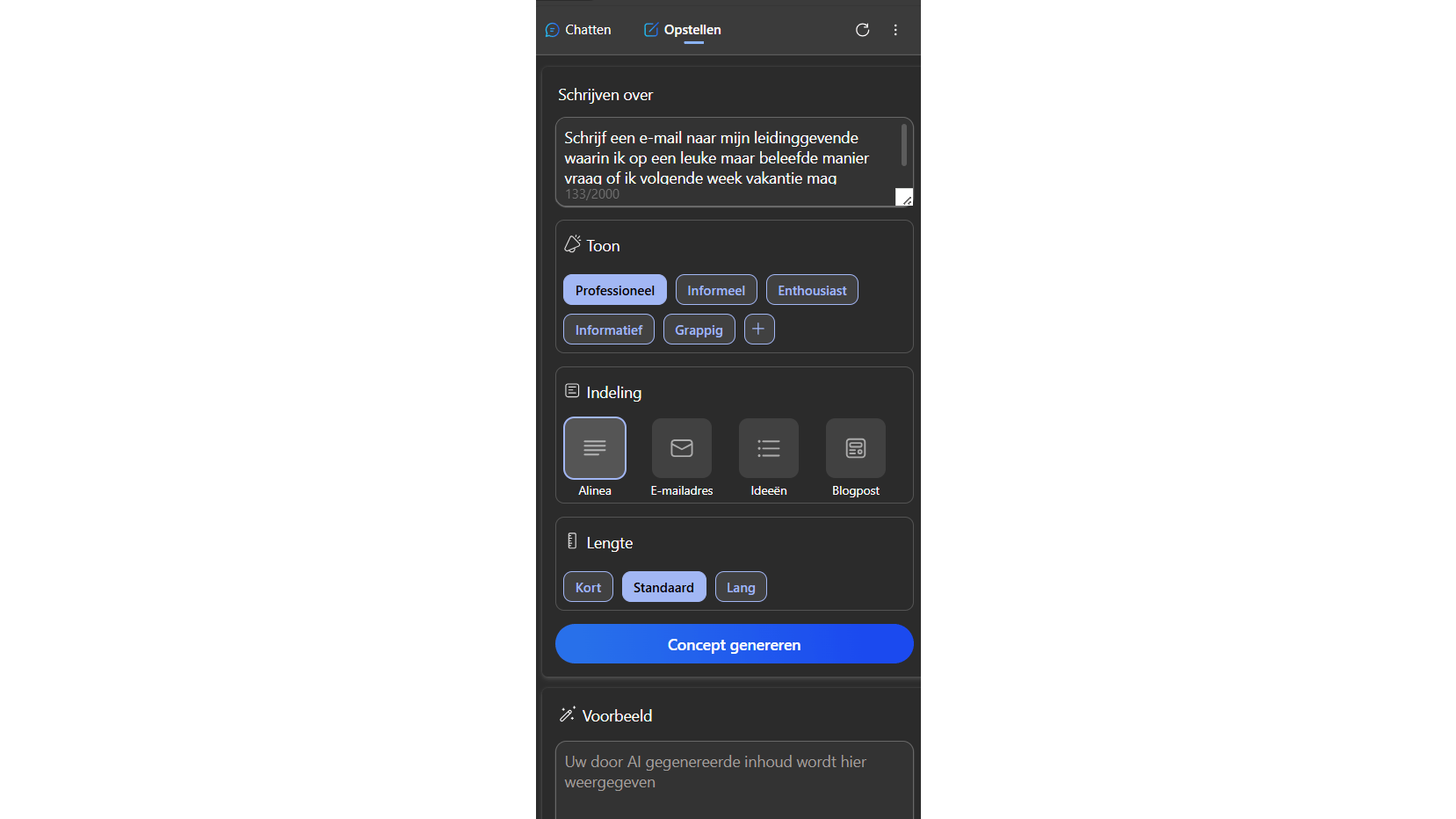 Daaronder bij Indeling bepaal je hoe de vormindeling van de tekst moet zijn. Wil je alinea’s, bullet points, e-mail- of een blogpost? De laatste keuze betreft de lengte: Kort, Standaard en Lang. Vervolgens gebruik je de knop Concept genereren om alvast een voorbeeld te zien van de gevraagde tekst. Ben je niet tevreden, dan klik je op de knop met de twee pijltjes die in een cirkel draaien. Dat is de functie Concept opnieuw genereren. Het is zelfs mogelijk om een stuk van de tekst te selecteren en dat te laten herschrijven.