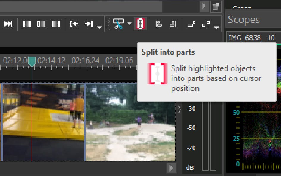 Je kunt een lang fragment ook in twee (of meer) delen opsplitsen. Dat is nuttig wanneer je deze videootjes op verschillende momenten in de film wilt tonen. Selecteer in de tijdlijn een videoclip en bepaal met de rode schuifregelaar een geschikt ‘splitmoment’. Overigens kun je met de mediaknoppen onder de voorbeeldweergave dit moment heel precies bepalen. Spoel bijvoorbeeld een seconde voor- of achteruit. Het is zelfs mogelijk om een video frame voor frame door te nemen. Staat de rode schuifregelaar exact op de goede plek? Klik dan in de werkbalk boven de tijdlijn op het pictogram met de twee rode haakjes. Je ziet vervolgens twee aparte clips.