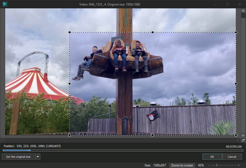 Nuttig om te weten is dat je met deze functie de oorspronkelijke resolutie verkleint. Zeker wanneer je de uiteindelijke film op een grote televisie of pc-monitor bekijkt, zie je mogelijk korrelige beelden. Snijd daarom liever niet te veel beeldmateriaal weg.