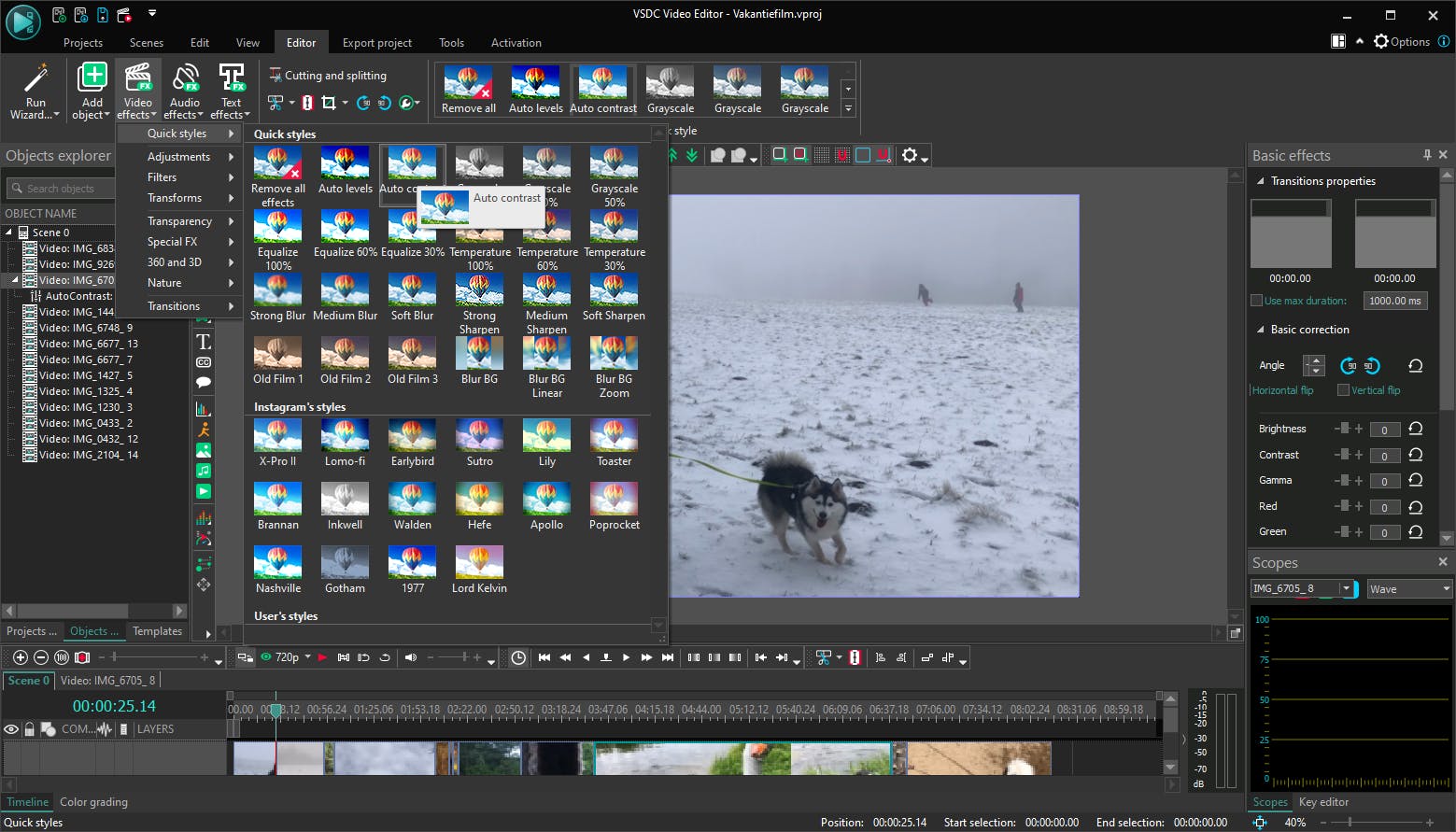 Wie dat wil, gaat in deze videobewerker helemaal los met speciale effecten. Klik maar eens bovenaan in de werkbalk op Video effects. Er verschijnt een uitgebreid menu. Voordat je iets uitkiest, selecteer je eerst een clip op de tijdlijn. Via Quick styles pas je heel makkelijk een effect toe, omdat hiervoor geen extra instellingen zijn vereist. Laat de video bijvoorbeeld op een gedateerde film uit de jaren ‘70 lijken of pas automatisch de contrastwaarden aan.