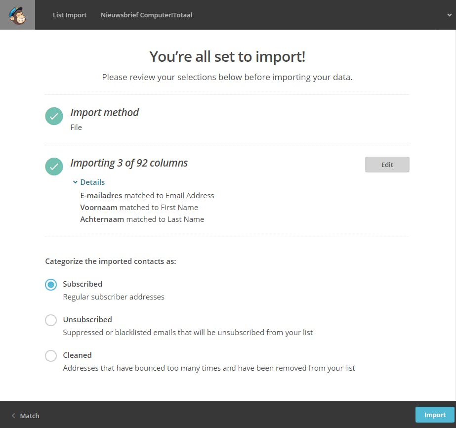 Met een lege abonneelijst vang je natuurlijk weinig aan. Je hebt nu in principe twee (complementaire) manieren waarop je contactpersonen kunt toevoegen: kant-en-klare adressen importeren of handmatig contactpersonen invoeren binnen MailChimp.