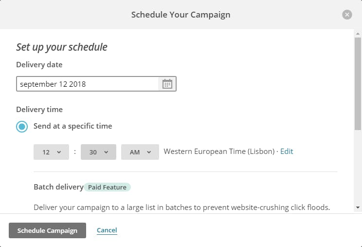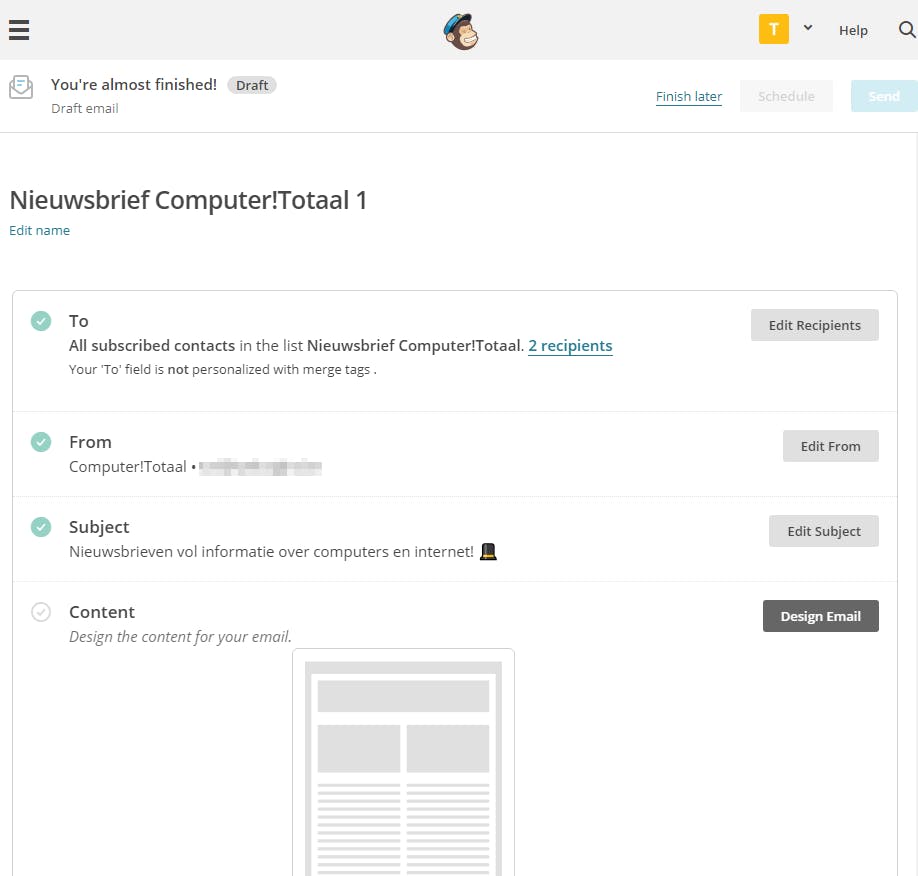 Wanneer je nieuwsbrief-editie is afgewerkt wil je die natuurlijk versturen, een proces dat MailChimp ook helemaal voor zijn rekening neemt. Ga naar Campaigns in je dashboard en klik de gewenste campagne aan. Je controleert bij To liefst nog even of inderdaad de gewenste ontvangers staan ingevuld. Dat kun je als dat nodig is nog bijsturen met Edit Recipients. Ziet alles er goed uit, klik dan rechtsboven op Send en bevestig met Send Now. We kunnen ons voorstellen dat je nieuwsbrief is afgewerkt maar dat je die toch op een later tijdstip wilt verzenden. Dan klik je niet op Send maar op Schedule, waarna je de gewenste datum en het tijdstip aanduidt. In de betaalde versie van MailChimp zijn er extra mogelijkheden beschikbaar, waaronder het laten verzenden op basis van de tijdzone van de ontvangers. Leg je keuzes vast met Schedule Campaign.