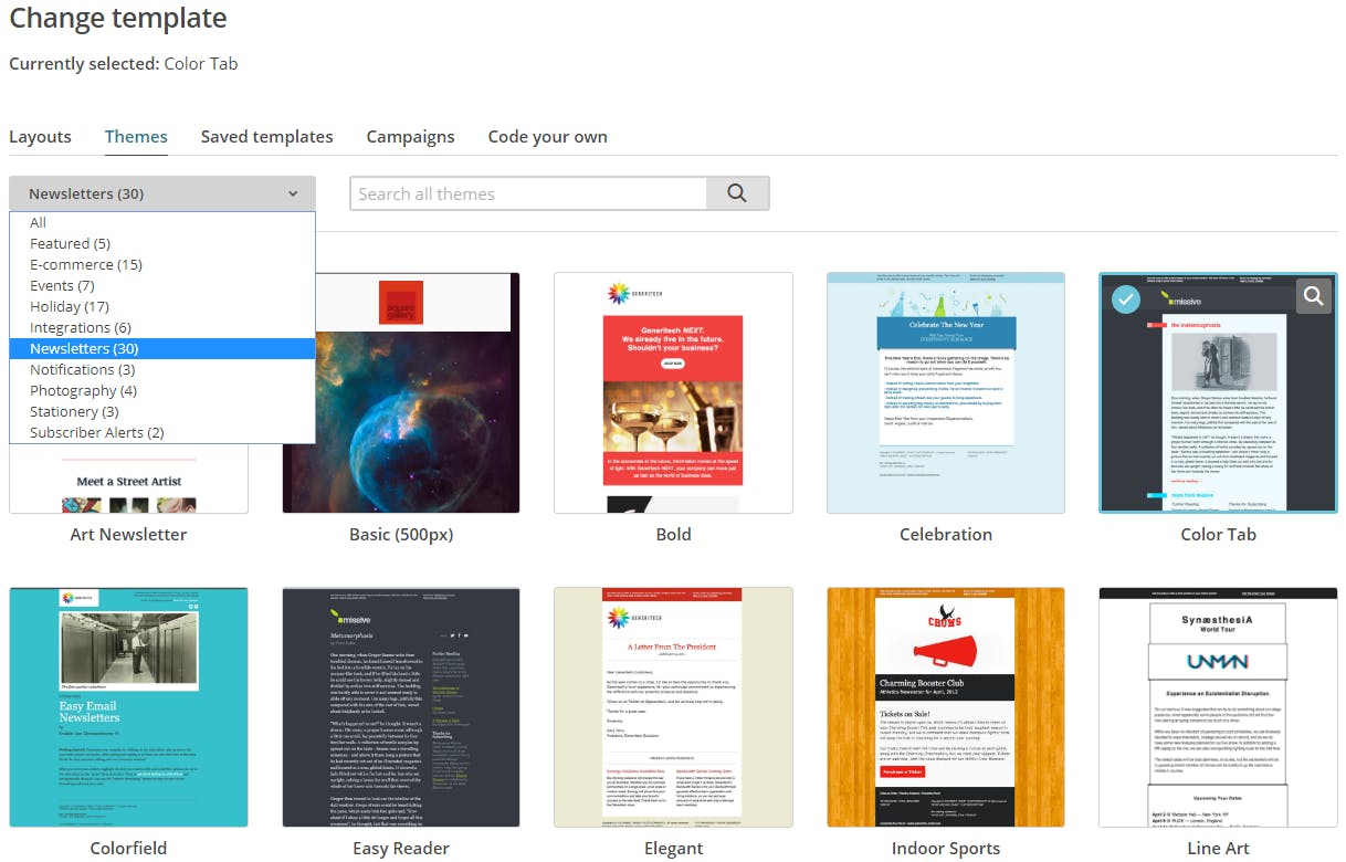 Belangrijk is uiteraard ook de knop Design Email, want die stelt je in staat je nieuwsbrief helemaal naar wens te lay-outen. Met deze knop open je immers een pagina met heel wat verschillende lay-outs en thema’s. In de rubriek Themes selecteren we de categorie Newsletters. Klik op een ontwerp om er verder mee aan de slag te gaan – wij kozen voor Color Tab, maar het staat je uiteraard vrij een van de 29 andere ontwerpen te selecteren. Wil je toch iets anders, klik dan onderaan links op < Back: Template. Heb je zelf al een lay-out ontworpen, dan kun je die ook importeren in MailChimp. Daartoe klik je op Code your own / Paste in code en plak je de html-code van je ontwerp in het venster. Sla je ontwerp op met Save.