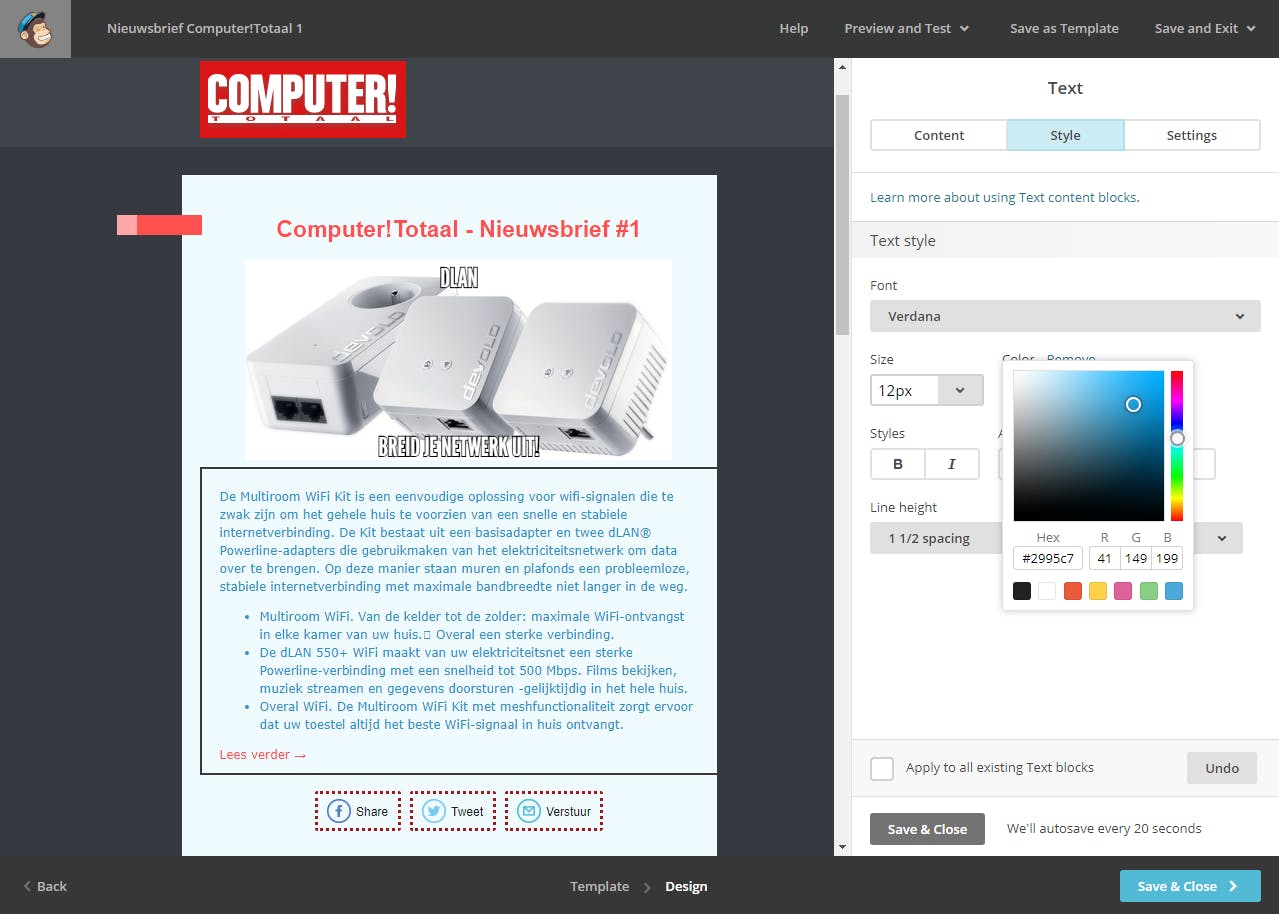 Via Save and Exit bewaar je je ontwerp, maar met Save as Template is het ook mogelijk dat als een sjabloon op te slaan, zodat je het ook voor je volgende nieuwsbrief-edities kunt gebruiken. Je vindt dit sjabloon dan terug op je dashboard in de rubriek Templates. Houd er wel rekening mee dat er in de gratis versie een MailChimp-logo onderaan je nieuwsbrief zal verschijnen – voor niets gaat de zon op.