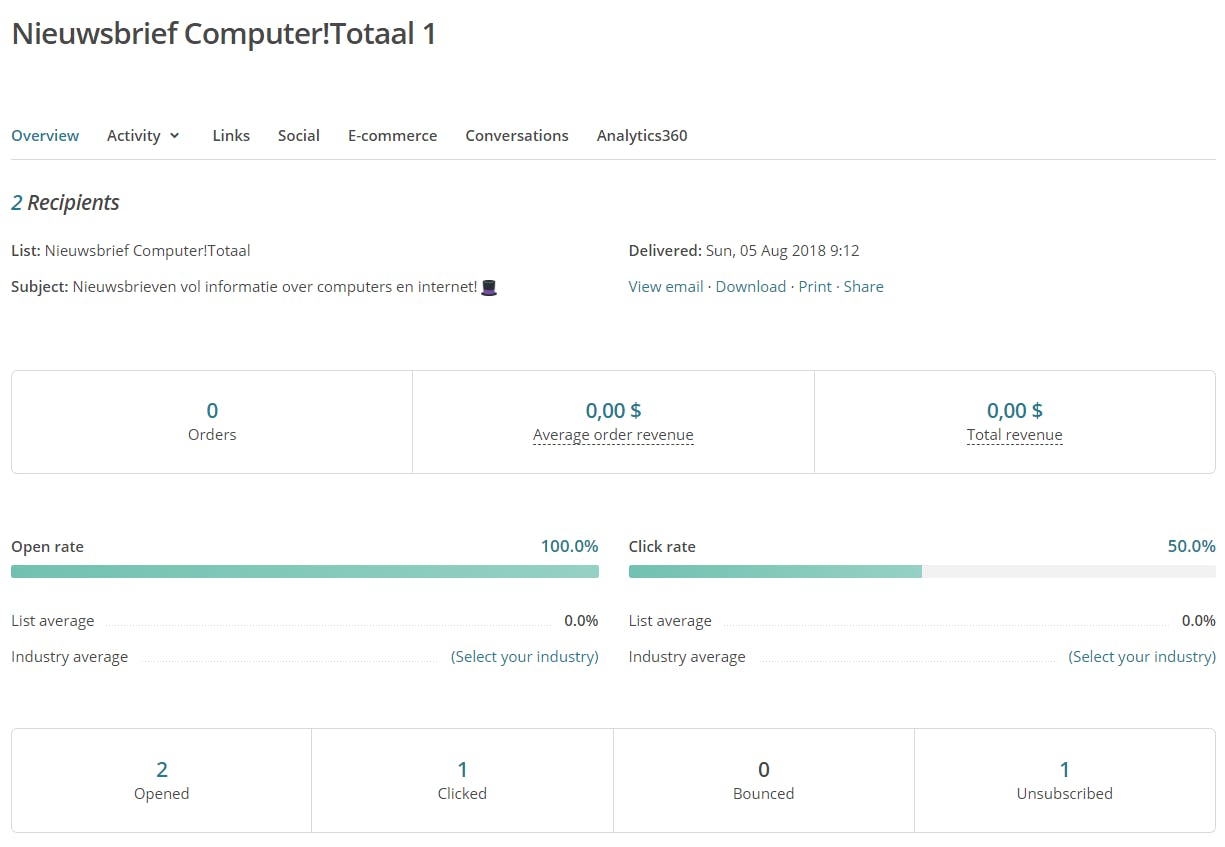 MailChimp houdt tevens nauwgezet rapporten bij over je nieuwsbrieven. Ga naar je dashboard en open de rubriek Reports, waarna je bij de gewenste nieuwsbrief op View Report klikt. Je komt nu terecht in de rubriek Overview voor een handig overzicht met de belangrijkste analyses.