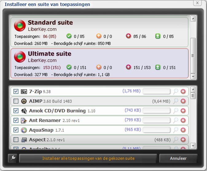 Bevestig alweer met Volgende / Ja / Volgende / Installeren. Na afloop druk je op Voltooien en start je LiberKey op - dat kan ook altijd via het bestand LiberKey.exe in de LiberKey-map. Even later verschijnt een leeg startmenu evenals een venster met de knop Download de lijst met beschikbare suites. Druk op deze knop en klik een van de drie beschikbare suites aan: Basic (14 toepassingen; 290 MB schijfruimte), Standard (86; 894 MB) en Ultimate (153; 1,1 GB). Overigens is het wel mogelijk vinkjes te verwijderen naast de onderdelen waar je geen behoefte aan hebt. Via het moersleutelicoon kun je trouwens in één keer alle items (de)selecteren. Bevestig je keuzes met Installeer alle toepassingen van de gekozen suite.