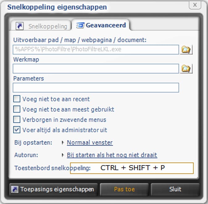 Klik je een toepassing slechts eenmaal aan, dan verschijnt een pop-upvenster dat de werking van het programma beschrijft. Je treft hier ook de link Eigenschappen aan, die je toestaat de naam, de beschrijving en het pictogram aan te passen. Op het tabblad Geavanceerd kun je bijkomende parameters invullen, een toetscombinatie aan de applicatie koppelen, er via Autorun voor zorgen dat de toepassingen automatisch met LiberKey opstarten, en aangeven dat je dit programma standaard als administrator wilt opstarten.