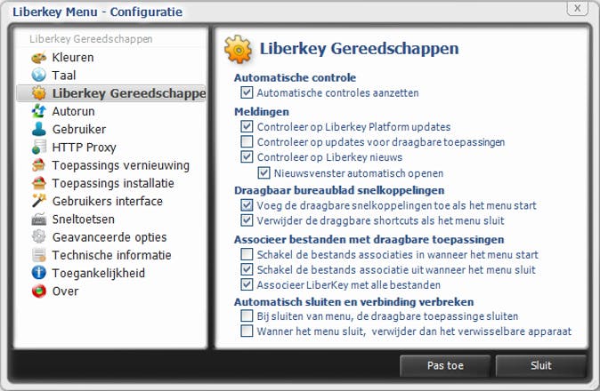 Met de tweede haal je ze weer weg. Wil je alle toepassingen die je momenteel in Liberkey hebt geopend in één keer netjes afsluiten, dan doe je dat met Sluit draagbare applicaties van je Liberkey. De optie Liberkey configuratie verzamelt zowat alle instellingen die te maken hebben met het uitzicht en de werking van het startmenu, zoals Kleuren, Taal en Gebruikers interface. Je vindt hier ook items terug als HTTP Proxy (ingeval je met een draagbare browser werkt die via een proxy moet gaan) en - enigszins verwarrend - nogmaals Liberkey Gereedschappen. Hier kun je onder meer aangeven dat de draagbare snelkoppelingen (zie ook boven) automatisch moeten verschijnen samen met het startmenu en weer moeten verdwijnen zodra je het startmenu afsluit (hoewel deze functie niet altijd goed blijkt te werken). Vergeet niet je aanpassingen te bevestigen met de knop Pas toe.