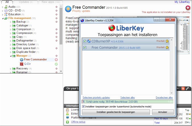 Net als bij gewone applicaties verschijnen ook voor draagbare toepassingen geregeld updates. Gelukkig neemt LiberKey je het updatebeheer grotendeels uit handen. Open Liberkey gereedschappen en kies Controleer op updates. Er doemt een venster op met twee update-knoppen. Met de bovenste knop update je het Liberkey Platform zelf, met de tweede knop haal je updates van de draagbare toepassingen op. Wanneer je de muisaanwijzer even boven zo'n toepassing houdt krijg je meer feedback over de update. Wil je alle updates automatisch laten installeren, selecteer dan alle updates, kies Installeer toepassingen zonder tussenkomst (automatische mode) en klik op Installeer geselecteerde toepassingen.