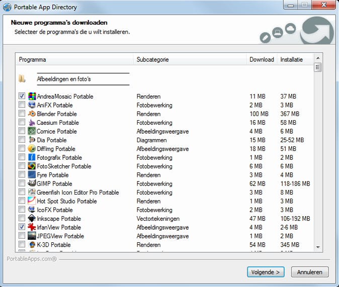 Het venster Portable Apps Directory verschijnt, een soort 'draagbare-app store' met een overzicht van alle nog niet eerder toegevoegde applicaties. Die zijn, net als bij LiberKey, opgedeeld in een tiental rubrieken: Afbeeldingen en foto's, Beveiliging, Hulpprogramma's, Internet, Kantoor, Muziek en video's, Onderwijs, Ontwikkeling, Spellen en Toegankelijkheid. Merk op dat je bij elk item twee bestandsgroottes afleest: de tweede is de grootte die het programma effectief, na 'installatie', op je stick zal benemen. Plaats een vinkje bij alle gewenste applicaties en druk op Volgende.