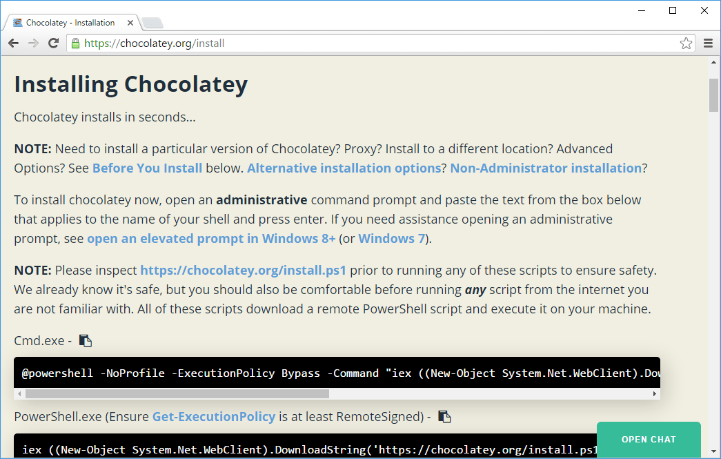 Voordat je Chocolatey-commando’s kunt geven, moet je Chocolatey eerst installeren. Dit gaat (hoe toepasselijk) eveneens met een speciaal commando. Druk op Windows-toets+X en open Opdrachtprompt (administrator). Er zijn vele mogelijkheden om Chocolatey te installeren. Een overzicht is te vinden achter het menu Install op www.chocolatey.org. De opdracht die bovenaan beschreven staat onder cmd.exe werkt goed.