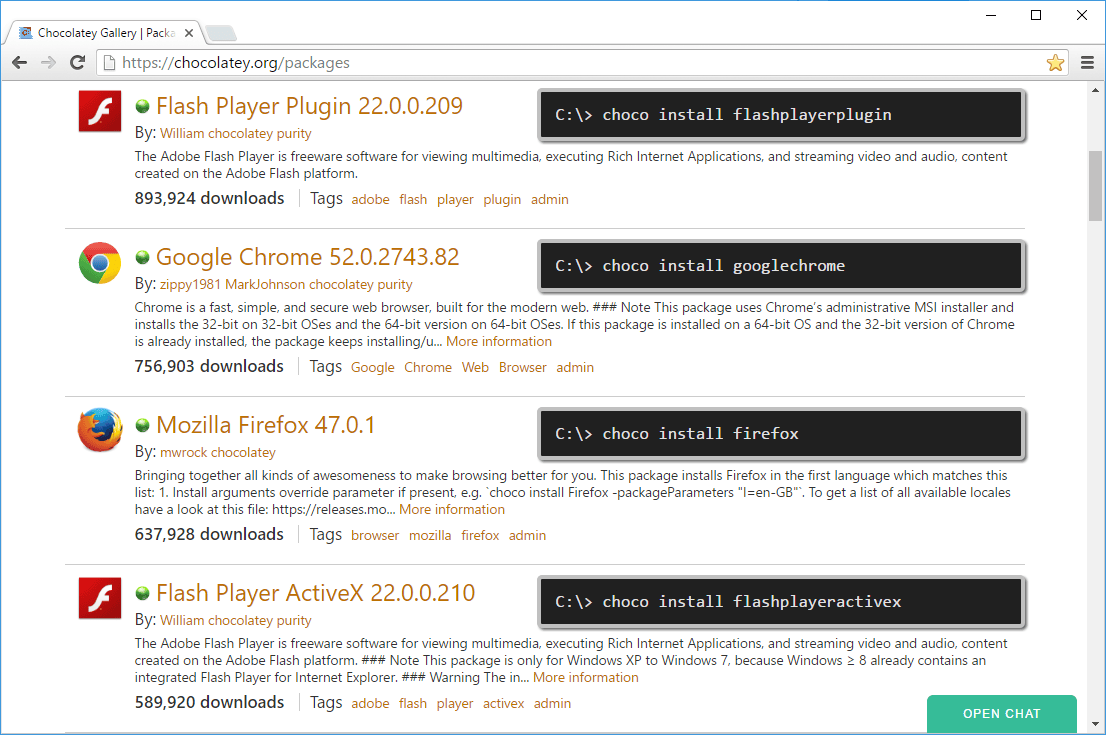 Ten tijde van schrijven waren er meer dan 4.000 populaire pakketten beschikbaar voor Chocolatey. Op www.chocolatey.org vind je onder Packages een compleet overzicht van de programma’s die je met Chocolatey-commando’s kunt installeren, updaten of verwijderen. De Chocolatey-commando’s zien er misschien op het eerste oog cryptisch uit, maar zijn wel logisch. Om Chrome te installeren, gebruik je bijvoorbeeld de opdracht choco install googlechrome en voor Adobe Reader choco install adobereader. Om nieuwe programma’s te installeren, open je altijd een opdrachtprompt als administrator.