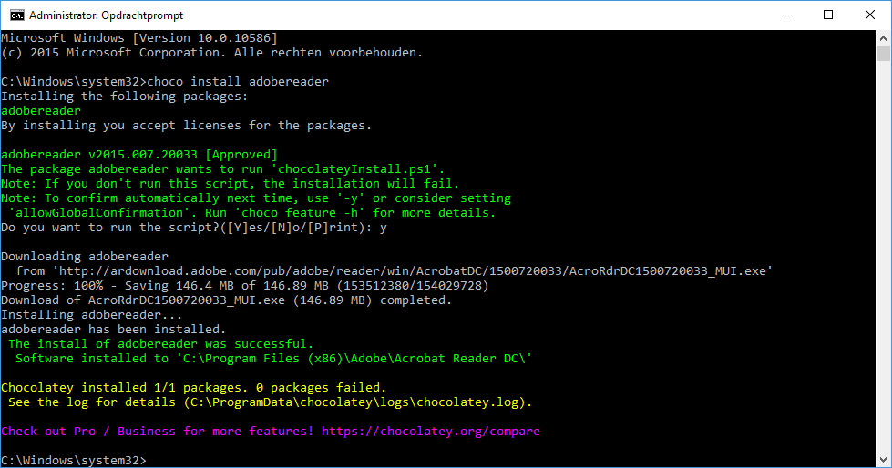 Voordat je Chocolatey echt gaat gebruiken, is het goed om met een paar opdrachten te experimenteren. Hierdoor leer je het programma goed kennen. Experimenteer met iets dat geen schade veroorzaakt als het misgaat, bijvoorbeeld Adobe Reader. Verwijder het programma eerst via de bekende weg in je configuratiescherm. Geef daarna de opdracht choco install adobereader om het programma weer te installeren. Met de opdracht choco upgrade adobereader wordt de Adobe Reader-installatie bijgewerkt naar de meest recente versie. Met choco uninstall adobereader verwijder je het programma van je computer.