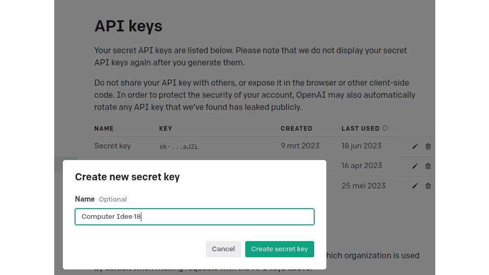 Meld je met je OpenAI-account aan op https://platform.openai.com en klik rechts bovenaan op je profiel. In het menu dat verschijnt, klik je op View API keys. Klik dan op Create new secret key, vul een naam in voor je sleutel en klik op Create secret key. Je krijgt dan je sleutel te zien, een lange reeks tekens.
