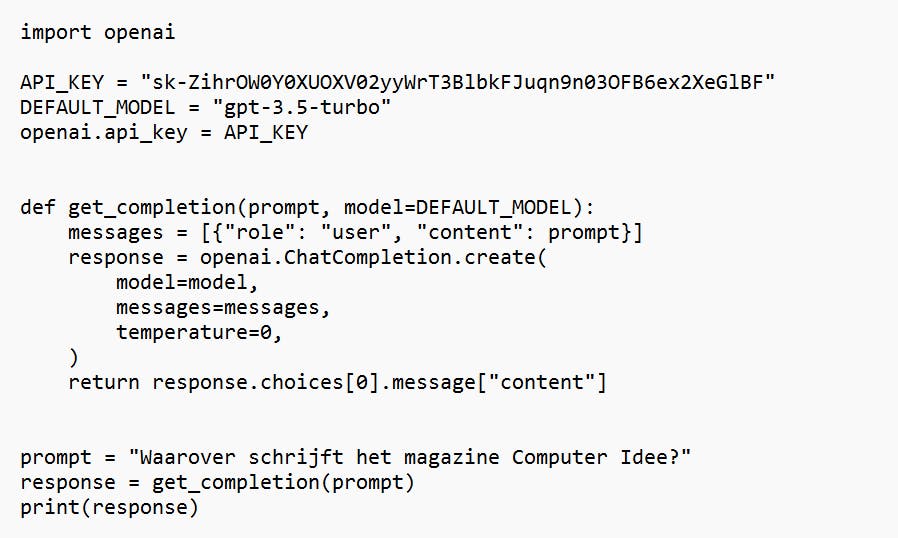Daarna maken we een hulpfunctie om gemakkelijker met de OpenAI-API te werken. Aan die functie geven we een prompt door (dat is de vraag die je stelt) en een optioneel model. De functie creëert dan een completion en haalt hieruit het resultaat. Op die manier kunnen we eenvoudig een prompt aan de functie doorgeven en het resultaat met print op de opdrachtregel tonen, zoals je in de laatste drie regels van dit Python-script ziet.