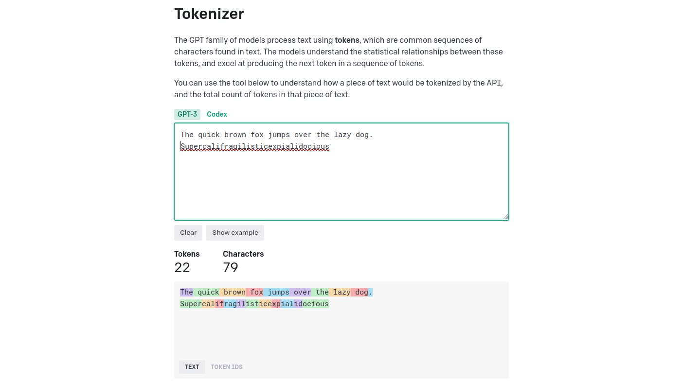 Een belangrijk concept bij gebruik van de OpenAI-API zijn tokens. Een token is een vaak voorkomende opeenvolging van tekens, zoals letters, cijfers of leestekens. Hier kun je zelf zien uit welke tokens een ingevoerde tekst bestaat.