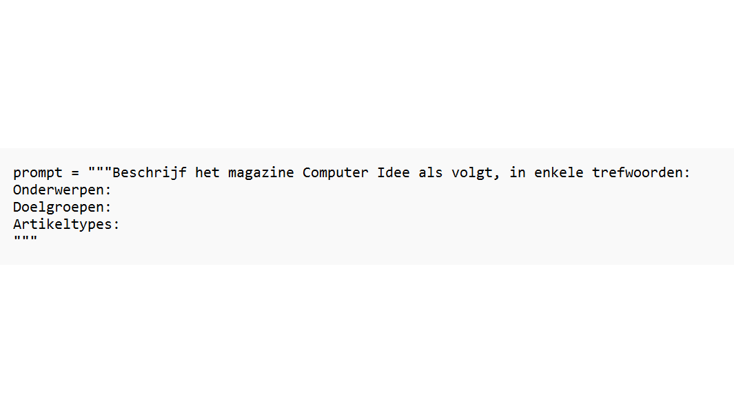 Een andere manier om je prompts specifieker te maken, is dat je het taalmodel vraagt om zijn antwoord in een specifiek format te geven. Bijvoorbeeld met: