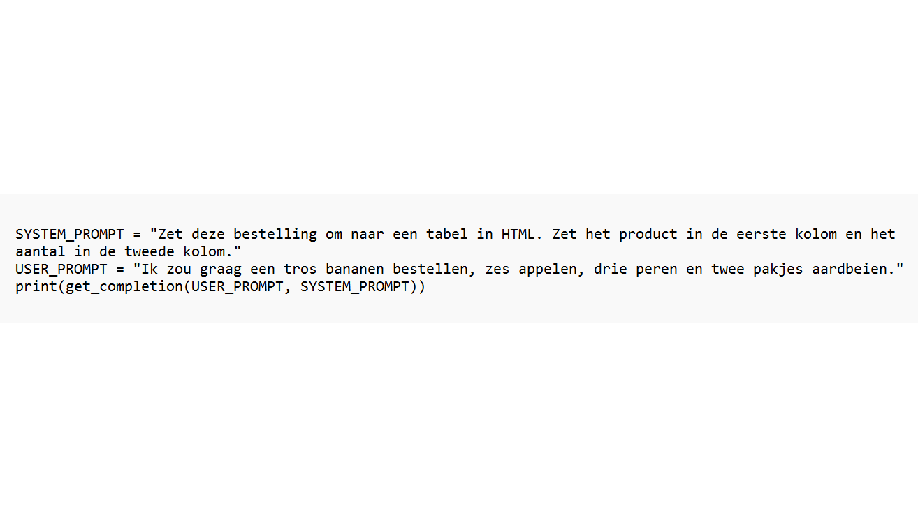 Als we hiermee een tekst willen vertalen, hebben we een systeemprompt nodig met de vertaalopdracht en een gebruikersprompt met de te vertalen tekst. Dat doe je door de volgende regels code aan het einde van de basiscode toe te voegen: