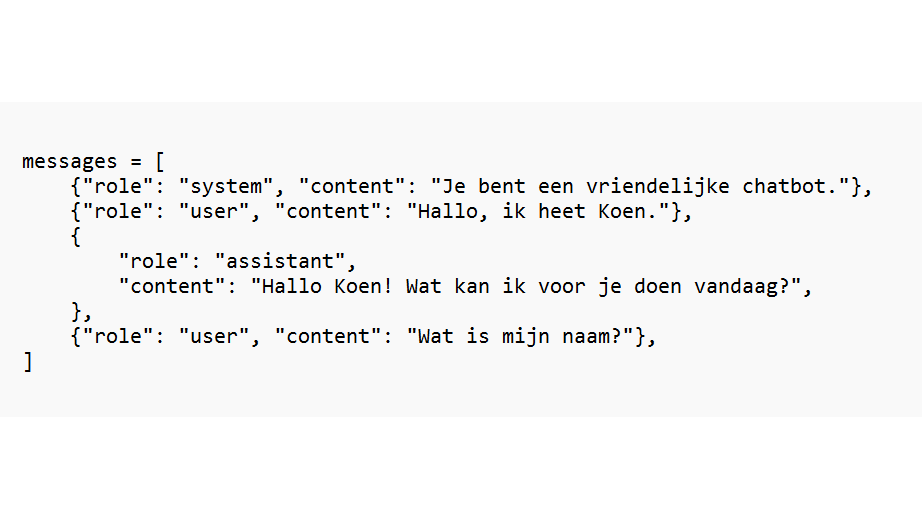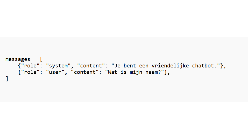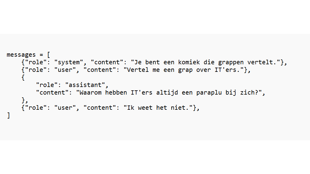 Een conversatie met de OpenAI-API kan er dan in Python als volgt uitzien in de vorm van boodschappen met een rol en inhoud: