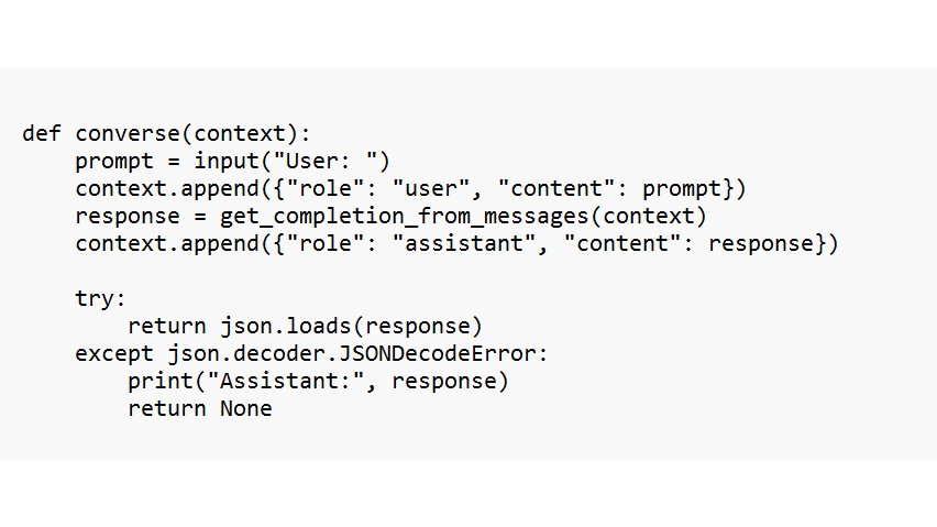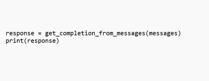 Om een conversatie te voeren, moet het taalmodel toegang tot de hele context hebben, met de vorige boodschappen die het taalmodel en jij hebben uitgewisseld. Daarom maken we in dit deel een nieuwe hulpfunctie: get_completion_from_messages. Daaraan geef je de hele geschiedenis van boodschappen door. Onze basiscode ziet er dan als volgt uit: