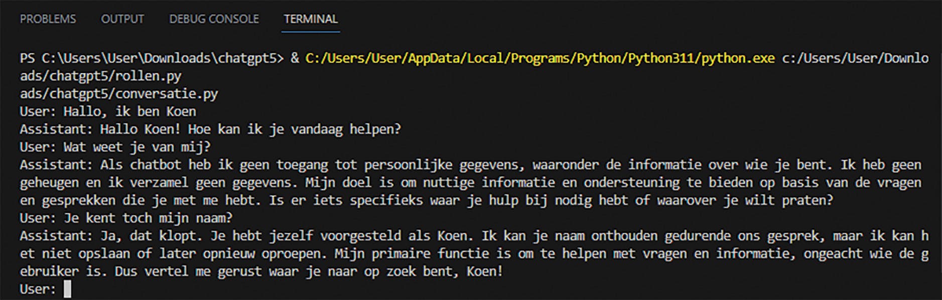 Als je dit programma uitvoert, zul je zien dat het taalmodel de naam heeft onthouden. Je krijgt dan immers een antwoord als: “Je naam is Koen. Dat heb je net verteld! Is er nog iets specifieks waar je meer over wilt weten?”