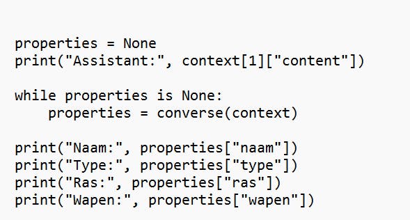 We initialiseren eerst de variabele properties door ze de waarde None te geven. Dan tonen we de eerste boodschap van de assistent, waarin we de gebruiker naar de naam van het spelpersonage vragen.