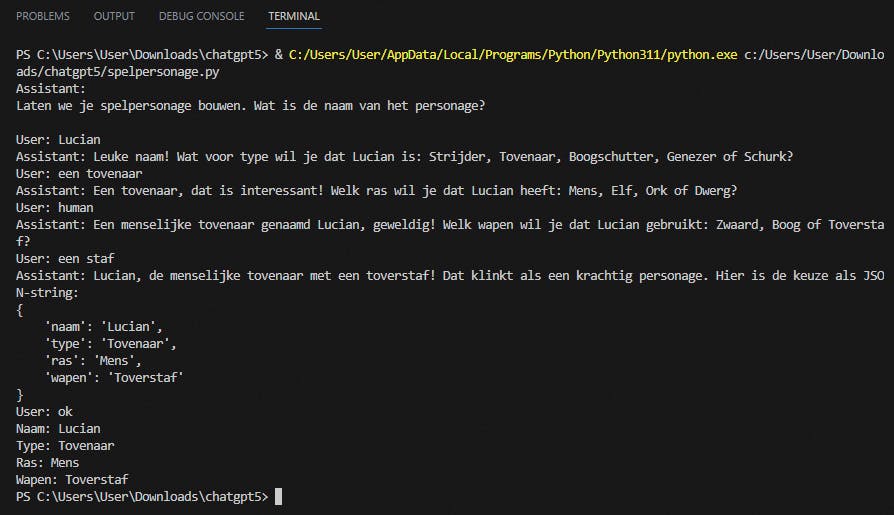 We hebben nu in wezen een eenvoudige interface voor ChatGPT gebouwd in een terminalvenster. Maar we willen hier een conversationele interface van maken om op een gebruiksvriendelijke manier invoer voor een groter programma te verkrijgen. Als voorbeeld nemen we een computerspel, waarbij je in het begin je spelpersonage moet ontwerpen.