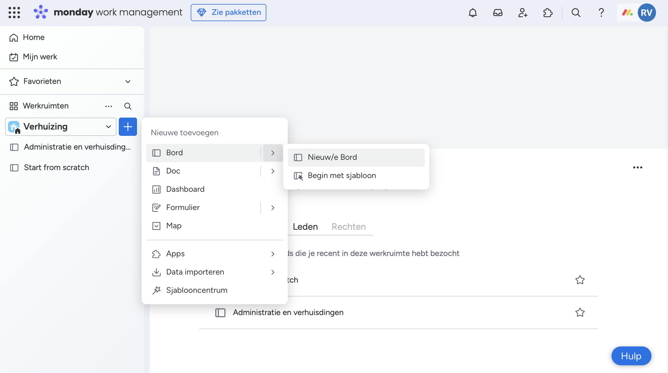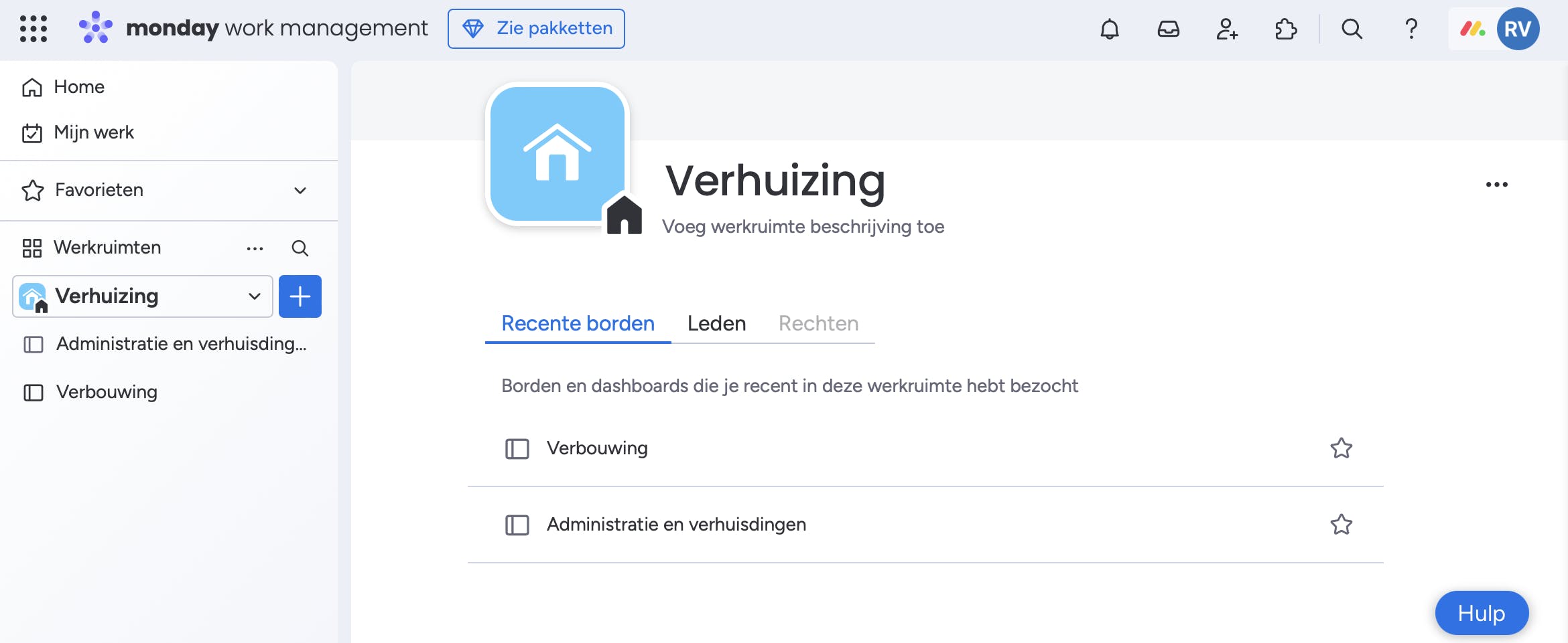 Je verandert de naam van deze werkruimte door erop te klikken en onder Mijn werkruimten nogmaals op de naam te klikken. In het rechtervenster pas je de naam aan. Een werkruimte is het hoogste niveau in de hiërarchie van Monday, direct eronder staan borden. Als Verhuizing een werkruimte is, dan kunnen Verbouwing, Administratie en Inpakken en organisatie drie verschillende borden zijn.