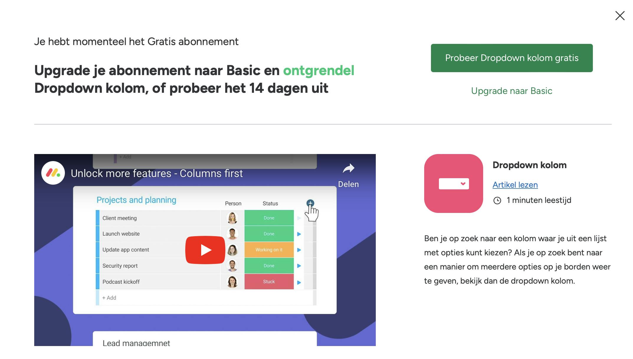 Sommige kolommen hebben een groen pictogram als je er met je muis overheen gaat. Dit betekent dat ze alleen in betaalde versies van Monday zijn te gebruiken. Je kunt zo’n kolom wel veertien dagen uitproberen door erop te klikken en op Probeer gratis te drukken.
