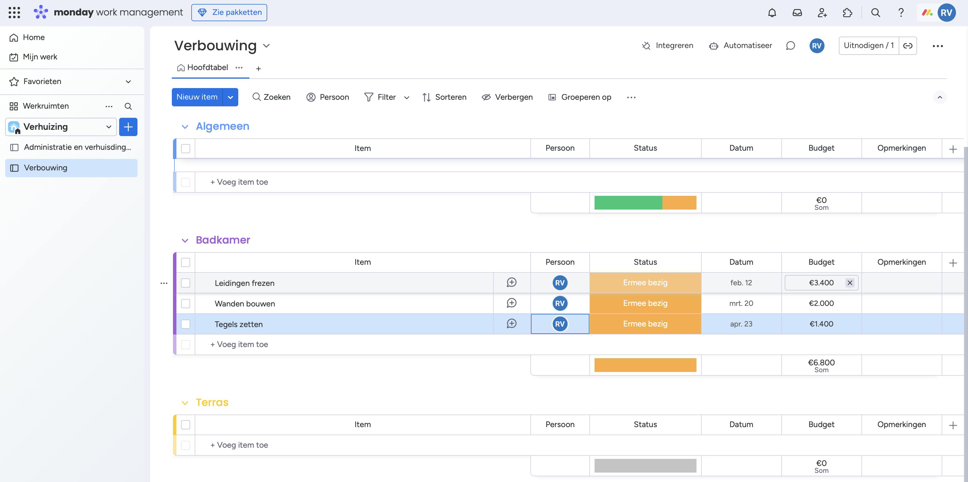 Elk bord heeft een aantal kolommen met informatie. Standaard zijn de kolommen Item, Persoon, Status en Datum te zien, maar door op het plusje ernaast te klikken, voeg je andere kolommen toe zoals Tekst of Nummers. Deze laatste is handig als je budgetten aan items wilt toewijzen.