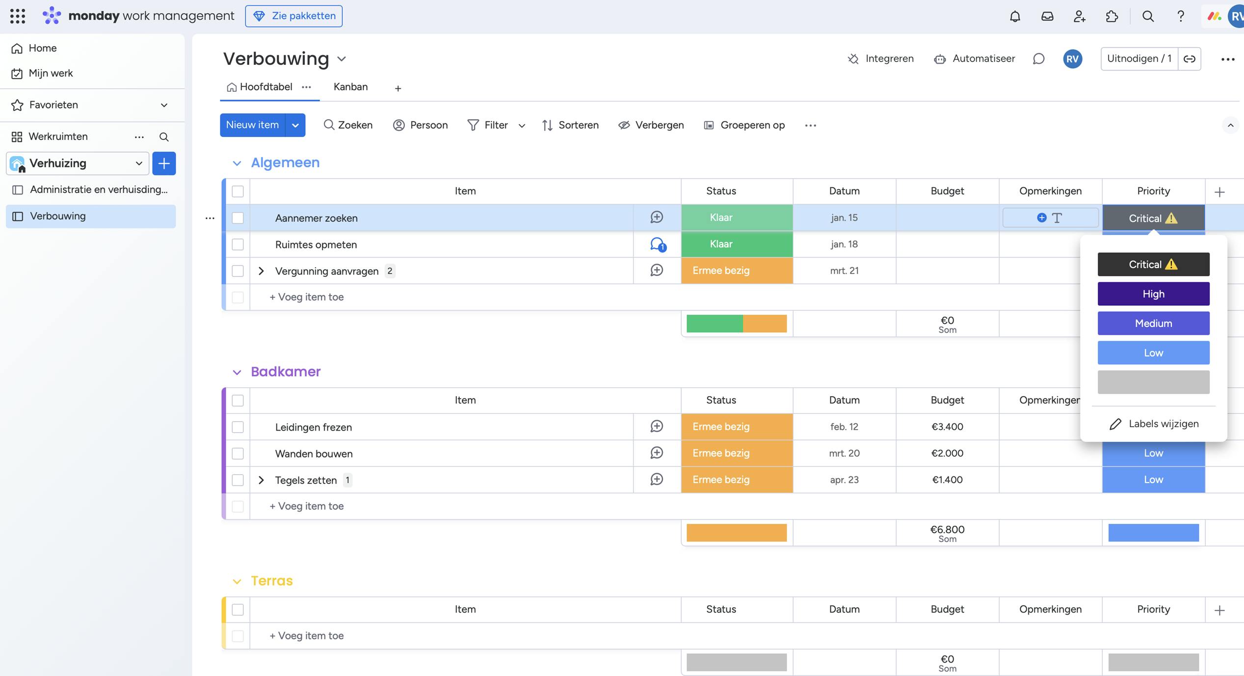 Bij projectbeheer hoort natuurlijk ook dat je weet welke taken belangrijk zijn en welke niet. Voeg daarom een kolom toe genaamd Priority. Nu kun je items een kleur geven op basis van urgentie, zodat duidelijk is welke taken prioriteit hebben. Monday heeft de labels nog niet in het Nederlands vertaald, maar als je op een label klikt en voor Labels wijzigen kiest, dan kun je alle namen veranderen of zelfs nieuwe labels met bijbehorende kleuren toevoegen.