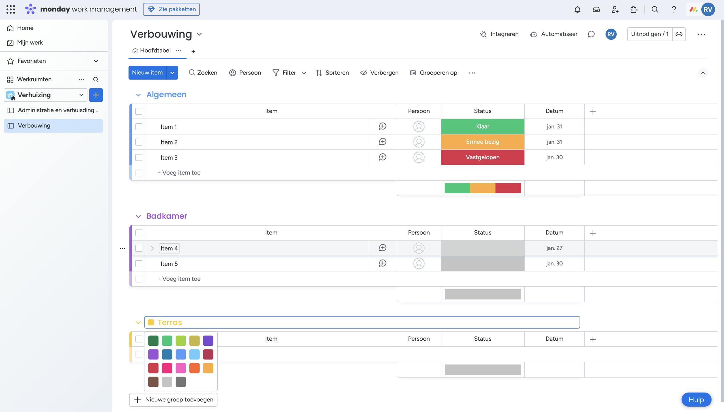 Je kunt een project in kleinere taken onderverdelen, in Monday-taal zijn dit groepen. Bij een verbouwing kun je bijvoorbeeld een algemene groep hebben, plus per onderdeel van je huis een groep. Je maakt een nieuwe groep aan door onderaan op Nieuwe groep toevoegen te klikken. Elke groep krijgt automatisch een kleur toegewezen, je kunt deze veranderen door op de drie puntjes te klikken als je er met je muis overheen beweegt en Groepskleur wijzigen te kiezen.