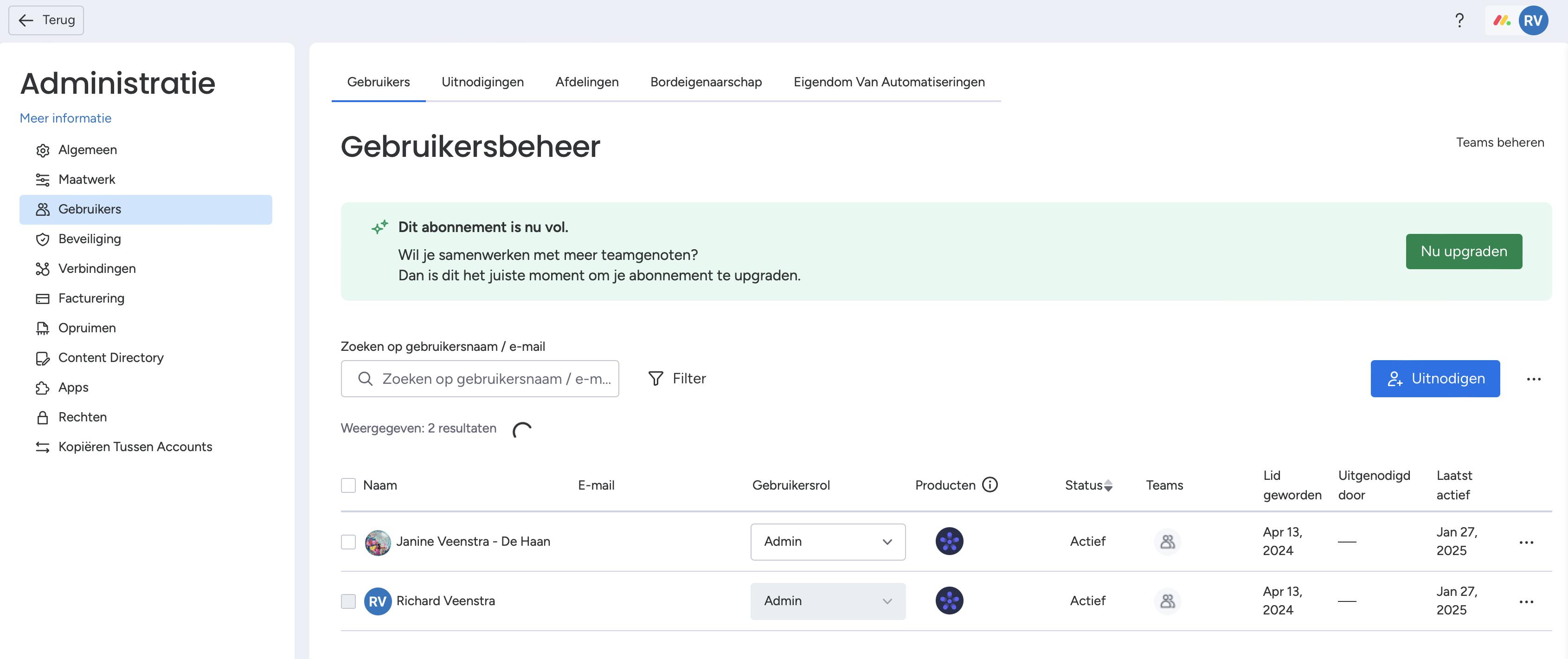 Je kunt in de gratis versie samenwerken met één extra persoon. Als je met dezelfde persoon aan alle borden wilt samenwerken (bijvoorbeeld je partner), dan kun je het beste een team maken met deze persoon. Dit doe je door rechts bovenin op je profielnaam te klikken en voor Teams te kiezen. Klik op Gebruikers beheren en vervolgens op Uitnodigen. Geef een e-mailadres op en klik op Uitnodigen. Onder Gebruikersrol bepaal je of de andere persoon ook administrator mag zijn. In de item-lijst kies je onder Persoon wie belast is met een specifieke taak.