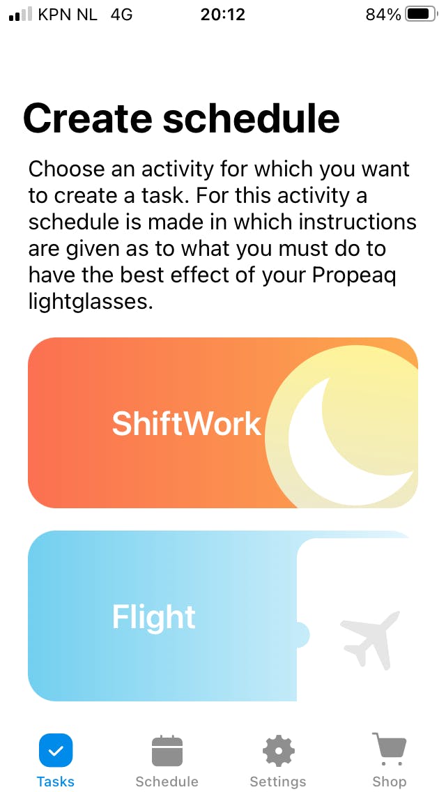 Voor wie vaak moet vliegen of in ploegendiensten werkt, is er ook nog een speciale app. Je vult wat gegevens in, waarna de app concludeert of je een ochtend- of een avondmens bent. Wanneer je nu je vluchtgegevens erin zet, of je werktijden, krijg je aanbevelingen wanneer je de bril moet opzetten en hoe lang.