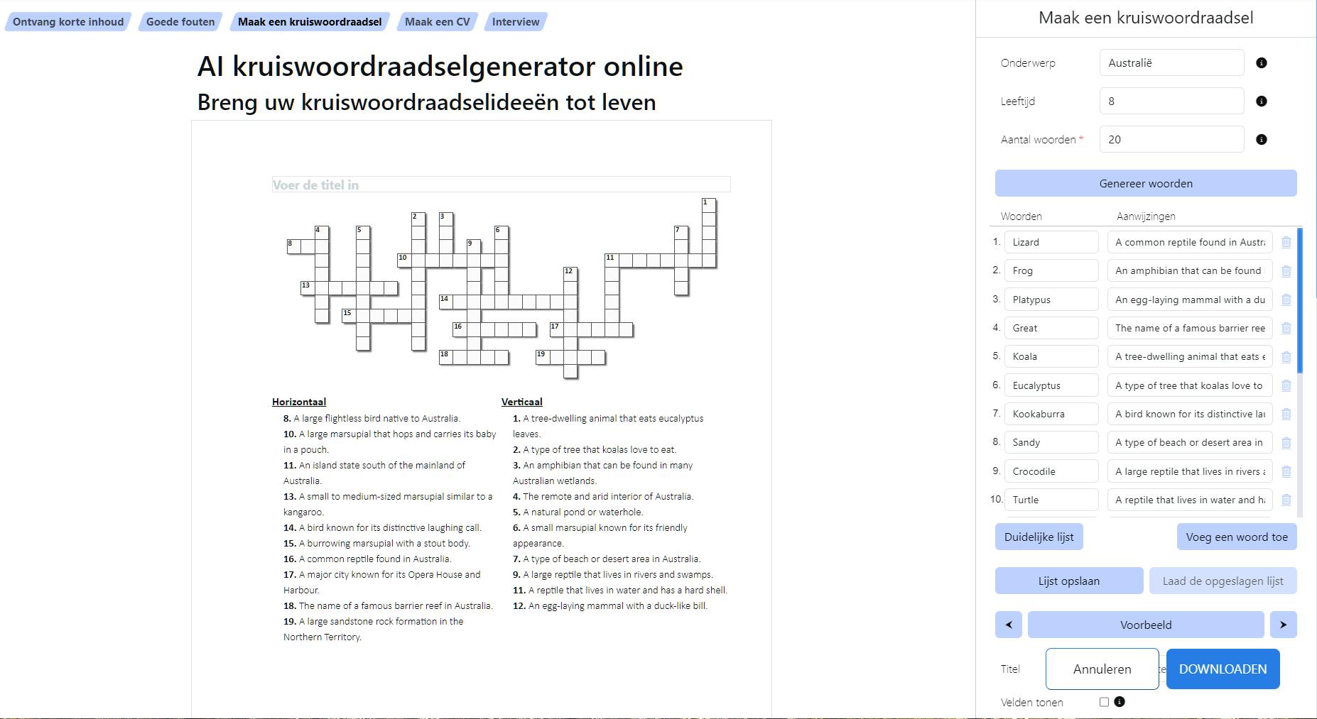 Je bent beter af met een van de beschikbare GPT’s die je vindt met een trefwoord als Crossword. Wij probeerden de GPT Crossword generator met deze prompt: Maak een leuk kruiswoordpuzzel rond het thema Australië, met twintig Nederlandstalige trefwoorden en bijbehorende omschrijvingen. Dit resulteert in een mooi resultaat. Onze vervolgprompt luidt: Maak een grafische, downloadbare versie. Nu hebben we een bruikbare kruiswoordpuzzel.