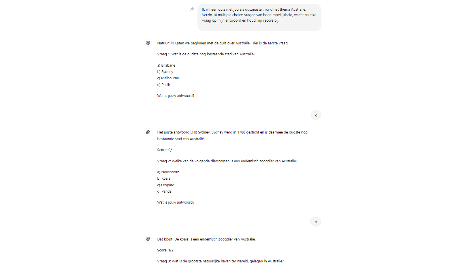 Je kunt ook interactief quizzen, met de chatbot als quizmaster. Hiervoor volstaat een prompt als Ik wil een quiz met jou als quizmaster, rond het thema Australië. Verzin tien moeilijke multiplechoicevragen, wacht na elke vraag op mijn antwoord en houd mijn score bij.