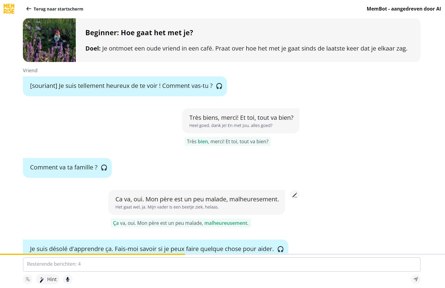 Een andere nuttige tool is Memrise, die je laat praten met de AI Membot in een specifieke context. Je kunt je woordenschat oefenen op basis van je interesses. Ook zijn er video’s die aansluiten bij de geleerde woordenschat. Je hebt wel een betaalde Pro-versie nodig (circa 58 euro per jaar) om alle lessen en video’s te ontgrendelen.