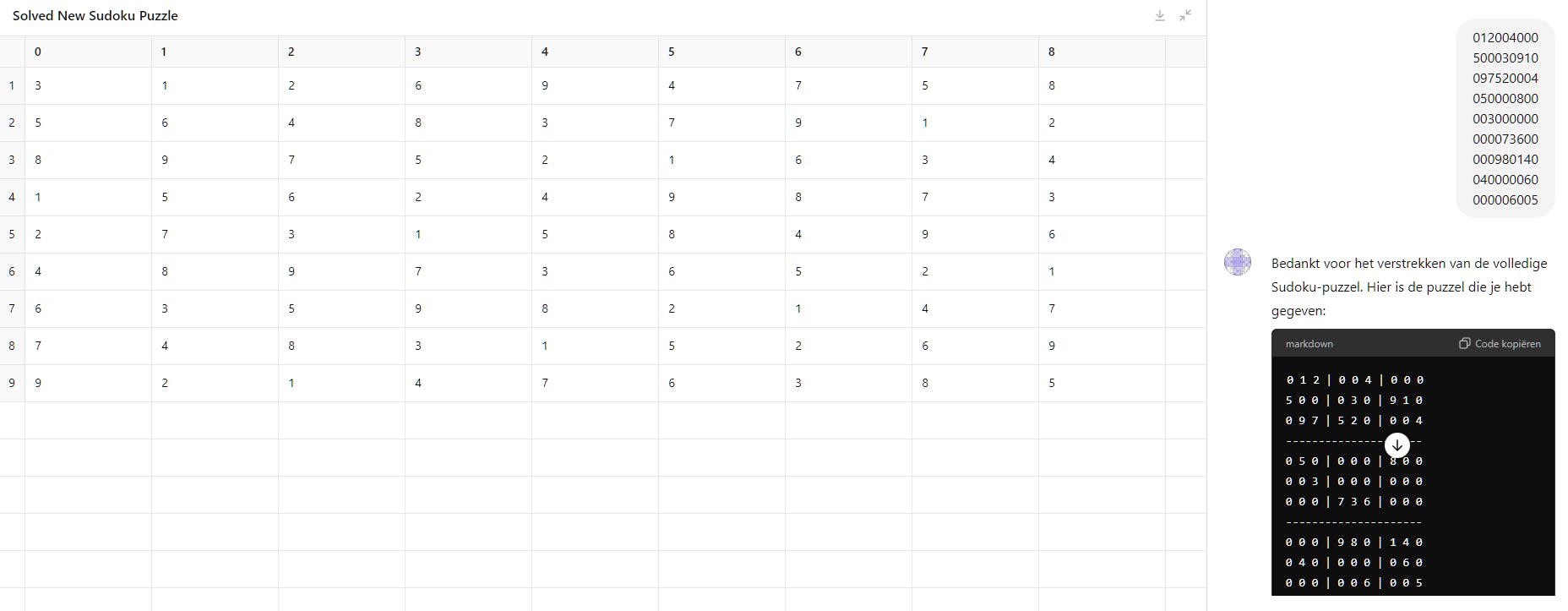 Het oplossen van een bestaande sudoku via AI is lastiger, maar toch kun je ook hiervoor een GPT gebruiken, zoals Sudoku (door community builder). Klik op Solve this Sudoku for me en schrijf de cijfers van het raster uit, bijvoorbeeld: 012004000. De GPT geeft je vervolgens de oplossing in tabelvorm.