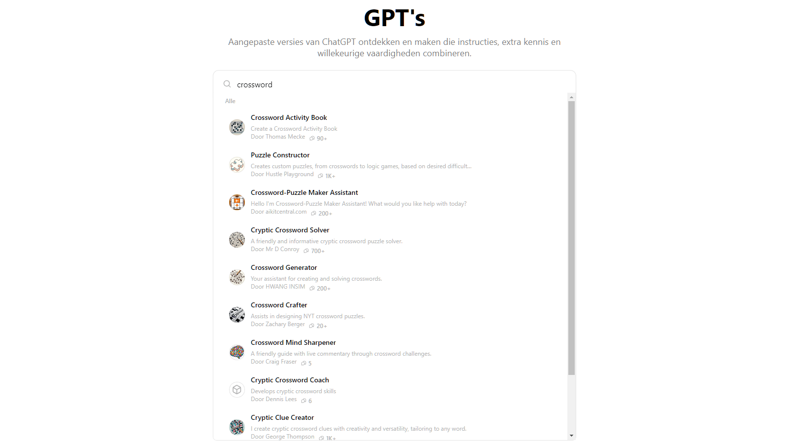 Om deze GPT’s te gebruiken, meld je je aan bij ChatGPT en klik je linksboven op GPT’s onderzoeken. Voer een geschikt trefwoord in de zoekbalk in; er verschijnen dan meerdere GPT’s met een korte omschrijving en het aantal gebruikers dat ze al hebben opgevraagd. Dat kan een indicatie zijn van de kwaliteit. Klik op een GPT voor de bijbehorende beoordelingsscore, een overzicht van de belangrijkste mogelijkheden en suggesties voor mogelijke gespreksopeningen met deze bot.