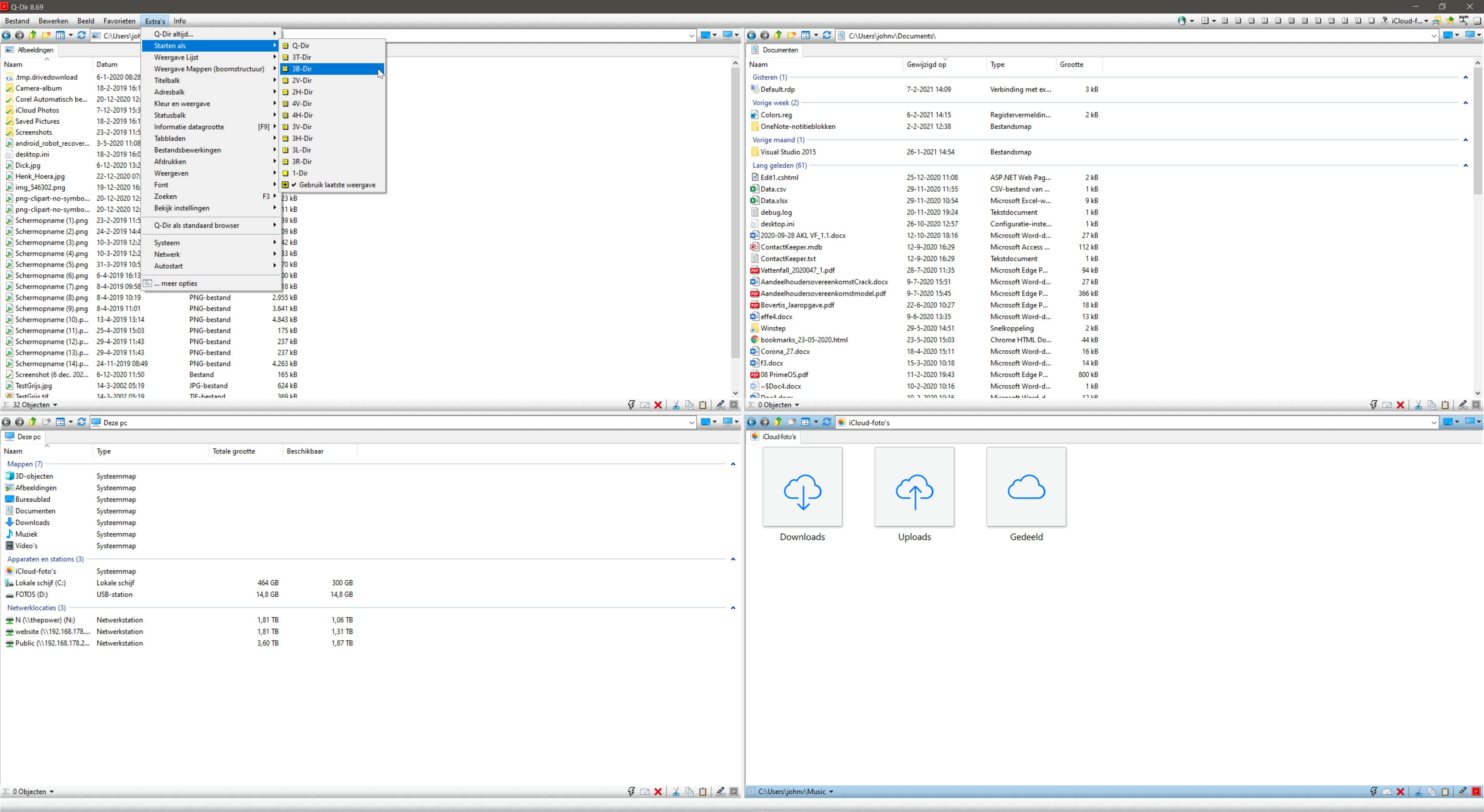 Schrik niet als je Q-Dir voor de eerste keer opent, want je ziet niet één, maar liefst vier bestandsvensters. Die bieden toegang tot lokale, netwerk-, cloud-, ftp-, systeem- en gecomprimeerde mappen. Kijk je ook even in het menu bij Extra’s en Starten als, want Q-Dir heeft meerdere gedaanten. Hiertussen kun je schakelen met de pictogrammen rechtsboven in beeld. Je kunt kiezen of je vier, drie, twee of misschien toch één bestandsvenster wilt zien.