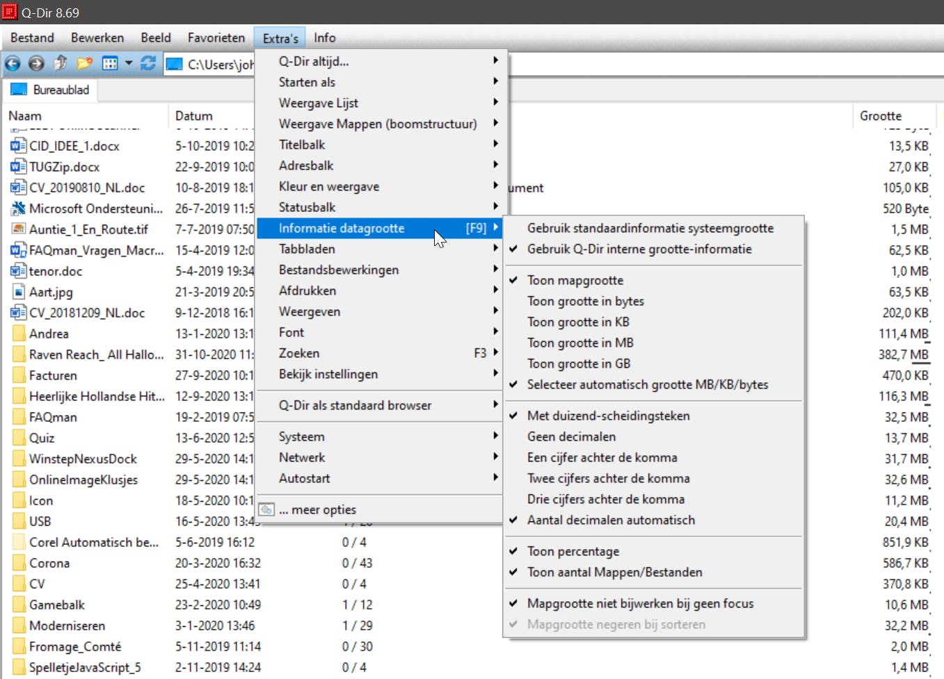 Over gewenste functionaliteit gesproken: je krijgt ook adequate informatie over de grootte van bestanden en mappen. Vooral dat laatste is in vergelijking met Windows Verkenner heel prettig. Q-Dir heeft hiervoor de speciale functie Informatie datagrootte gebouwd. Deze vind je in de menubalk Extra’s en met de functietoets F9. Q-Dir heeft overigens een aantal Windows Verkenner-functies overgenomen: F3 om te zoeken, F5 om te verversen en F11 voor een volledig scherm.