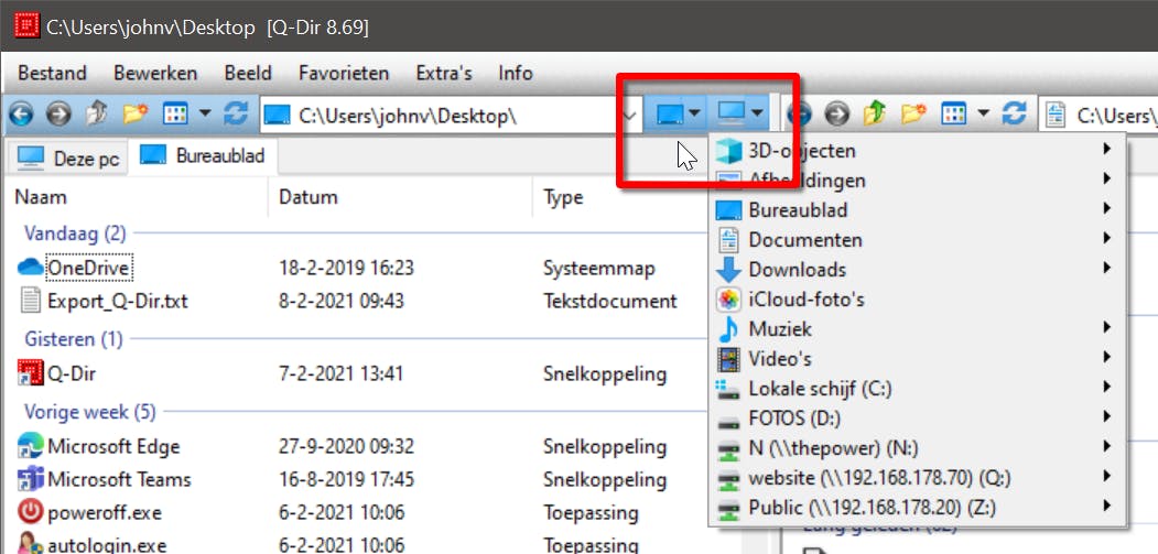 Zoals gewoonlijk leer je een programma kennen door het te gebruiken en dat geldt ook voor Q-Dir. En het leuke van dit programma is dat je steeds weer nieuwe handigheidjes ontdekt. Zo vind je rechtsboven op de adresbalk (ieder bestandsvenster heeft er een) twee pictogrammen waarmee je direct op het bureaublad en bij Deze PC komt.