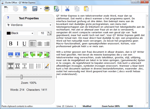 QT Writer Express is een tekstverwerker zoals Word, maar dan op zakformaat. Dat merkt u direct wanneer u het programma opent. De interface bestaat uit drie delen: een beknopt menu aan de bovenkant met duidelijke grote pictogrammen, een menu met teksteigenschappen aan de linkerkant en uiteraard het tekstgedeelte aan de rechterkant. Het ziet er allemaal zeer fraai uit en dat is verrassend, aangezien dit soort compacte varianten het vaak toch 'net niet' zijn. Voor QT Writer Express geldt dat echter totaal niet. Om maar direct heel duidelijk te zijn: een programma als Word zal het natuurlijk nooit vervangen. Zo bevat het programma geen Macro-functionaliteit, geen opmaakprofielen enzovoort. Kortom, voor professioneel gebruik hebt u er niets aan.