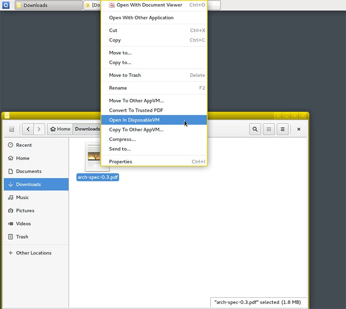 Als je in een qube een document hebt gedownload en je plots twijfelt of het wel veilig is om te openen, komen de wegwerpqubes ook van pas. Rechtsklik dan op het dubieuze bestand en klik op Open In DisposableVM, waarmee je het document in een wegwerpqube opent. Meer nog: als je het daarna sluit, worden eventuele wijzigingen die je aan het document hebt aangebracht gekopieerd naar de originele qube.