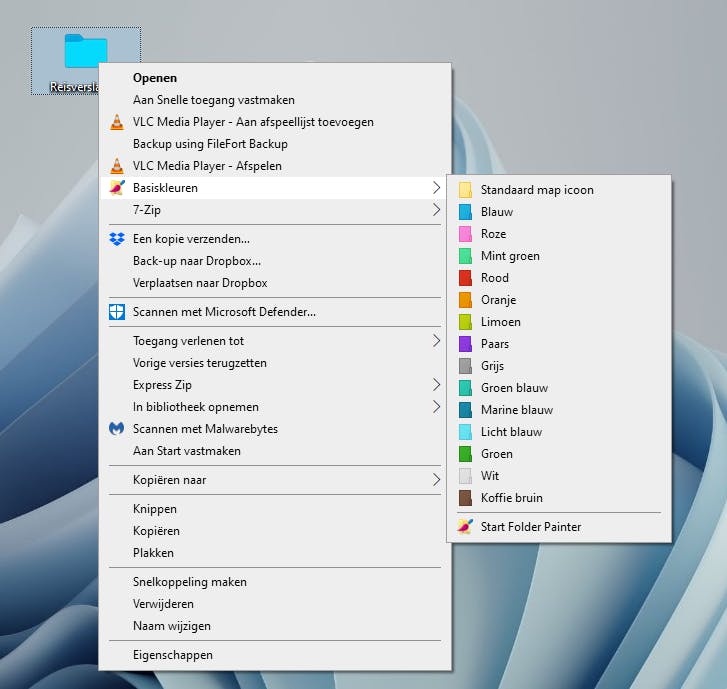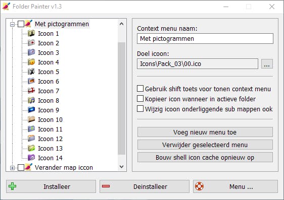 Als je een pakket selecteert en je klikt op de knop Installeer, dan worden deze pictogrammen aan het contextuele menu toegevoegd. Vanaf dat moment kun je in Windows Verkenner simpelweg met de rechtermuisknop op een map klikken om die daarna via het contextuele menu van een ander kleurtje of een ander pictogram te voorzien.