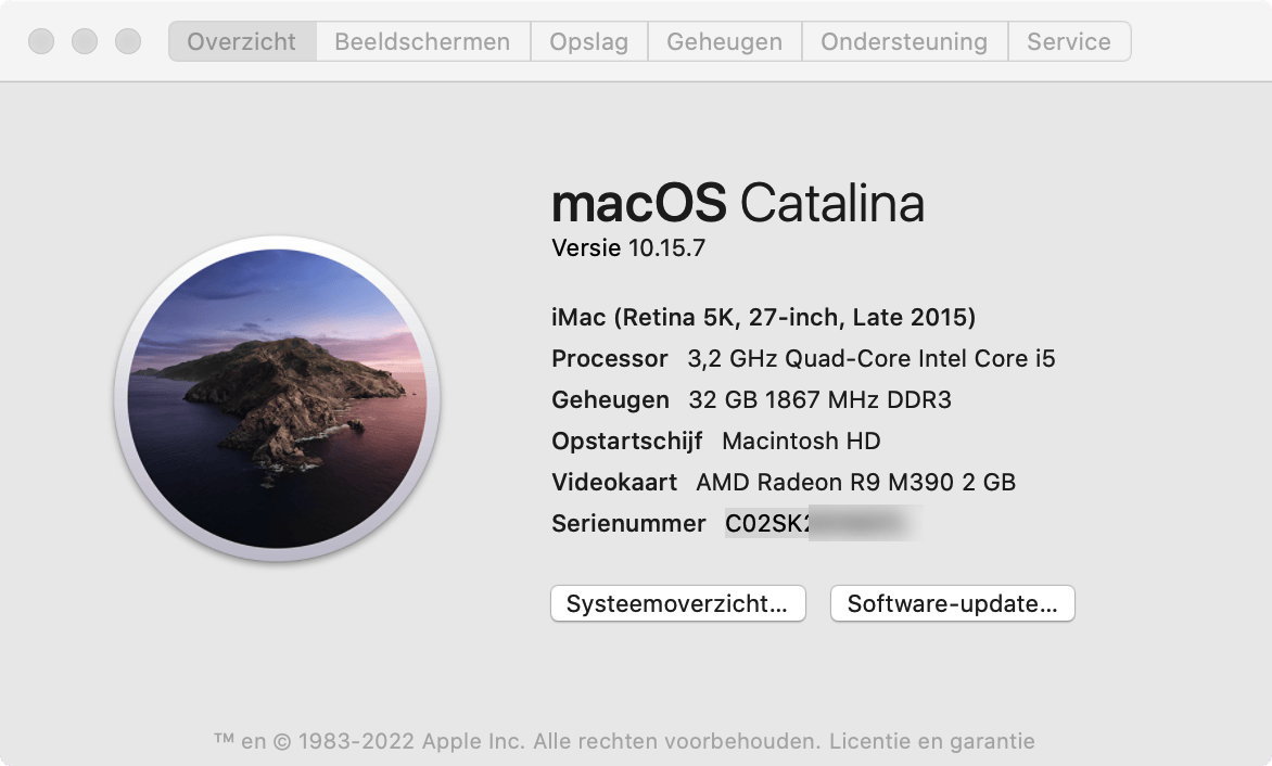 Ook bij een Mac is de productiedatum gekoppeld aan het serienummer. Omdat de Mac volledig door Apple is gebouwd, is er een gestandaardiseerd proces om de datum van deze computer te vinden. Eerst moet je het serienummer kennen. Klik op het Apple-pictogram en daarna op Over deze Mac. Vervolgens kijk je op het tabblad Overzicht en daar lees je de serienummer. Noteer of kopieer deze gegevens en plak dit serienummer in de garantiepagina van Apple. Je moet dan nog even een code invoeren om aan te tonen dat je een mens bent en dan verschijnen de gegevens over het productiejaar en de garantie.